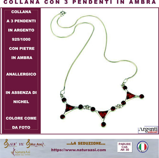 AR COLLANA A 3 PENDENTI IN ARGENTO 925/1000 CON PIETRE IN AMBRA