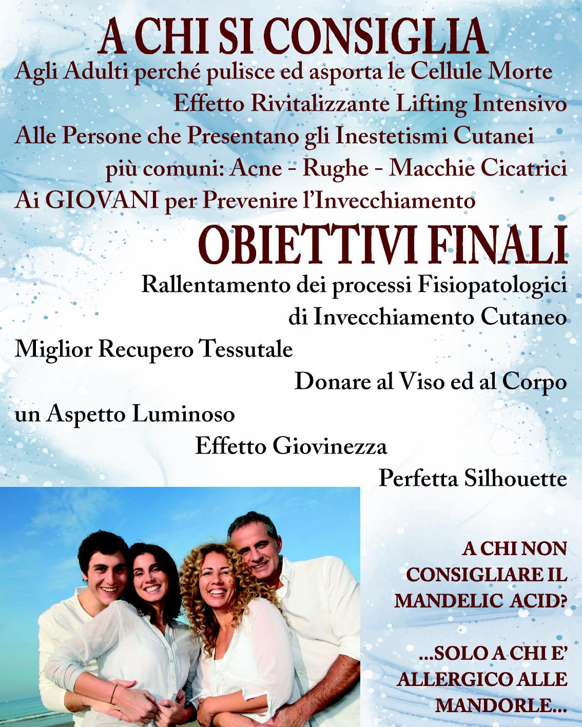 E' un Peeling medio profondo all'acido Mandelico è un peeling chimico, attivo nella riparazione e riattivazione della pelle; elimina le cellule morte dello strato superficiale; facilita l'eliminazione di impurità e delle macchie; dona luminosità e colorito omogeneo alla pelle del viso, collo e decolleté .