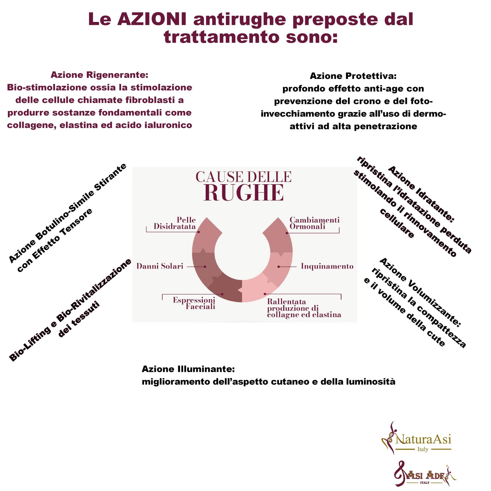 Vantaggi: -Azione botulino-simile; -Distende e riempie le rughe modulando la mimica facciale; -Stimola della produzione di collagene; -Rallenta l'invecchiamento cutaneo; -Restituisce elasticità alla pelle.